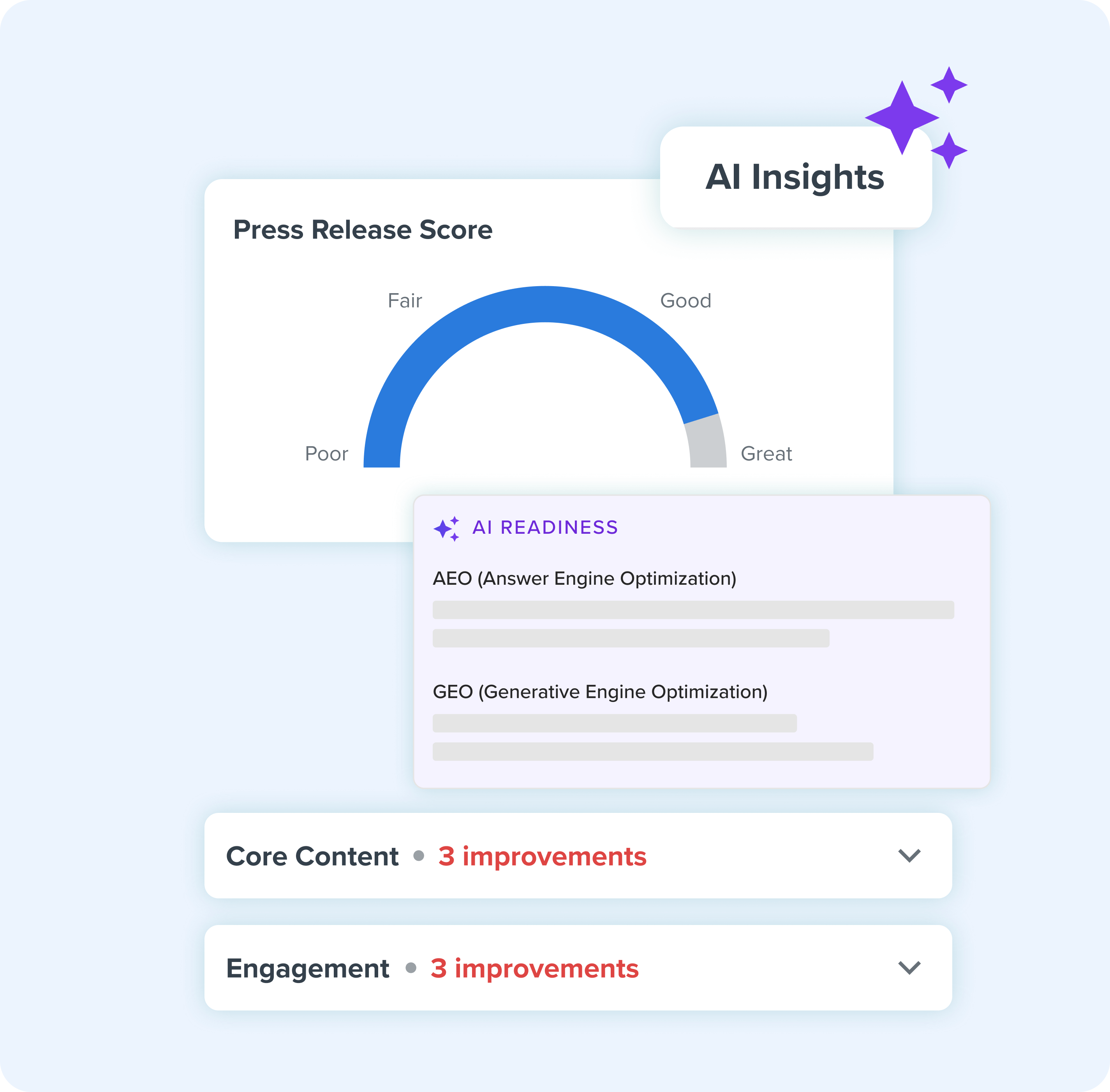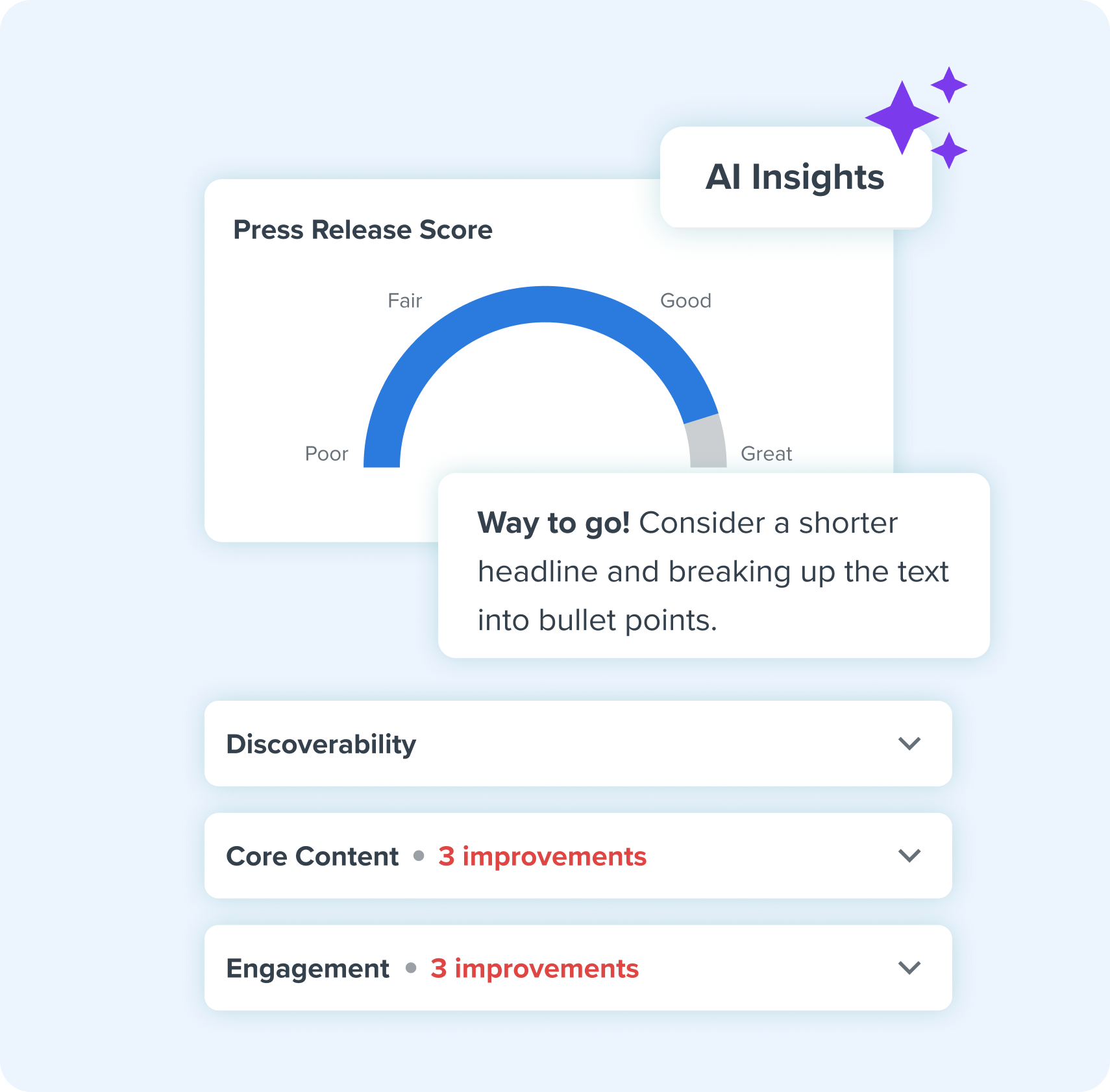 The Press Release Score provides insights and tailored recommendations to improve press release content. By leveraging historical performance data, industry best practices and generative AI, the tool evaluates your release from "Poor" to "Great." It evaluates key elements such as headlines, quotes, structure, calls to action and news angles, offering actionable feedback for refinement. This feature speeds up the drafting process and enhances the quality of content.