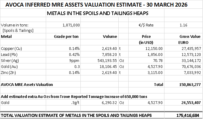 Based on current prices of metals and based on the Mineral Resource Estimate prepared by CSA Global in their report No. R369.2018, plus the additional gold ounces from the Trove Metal reported tonnage increase (+650,000 tons), the following table sets out a valuation of the inferred metals in the spoils and tailings:
