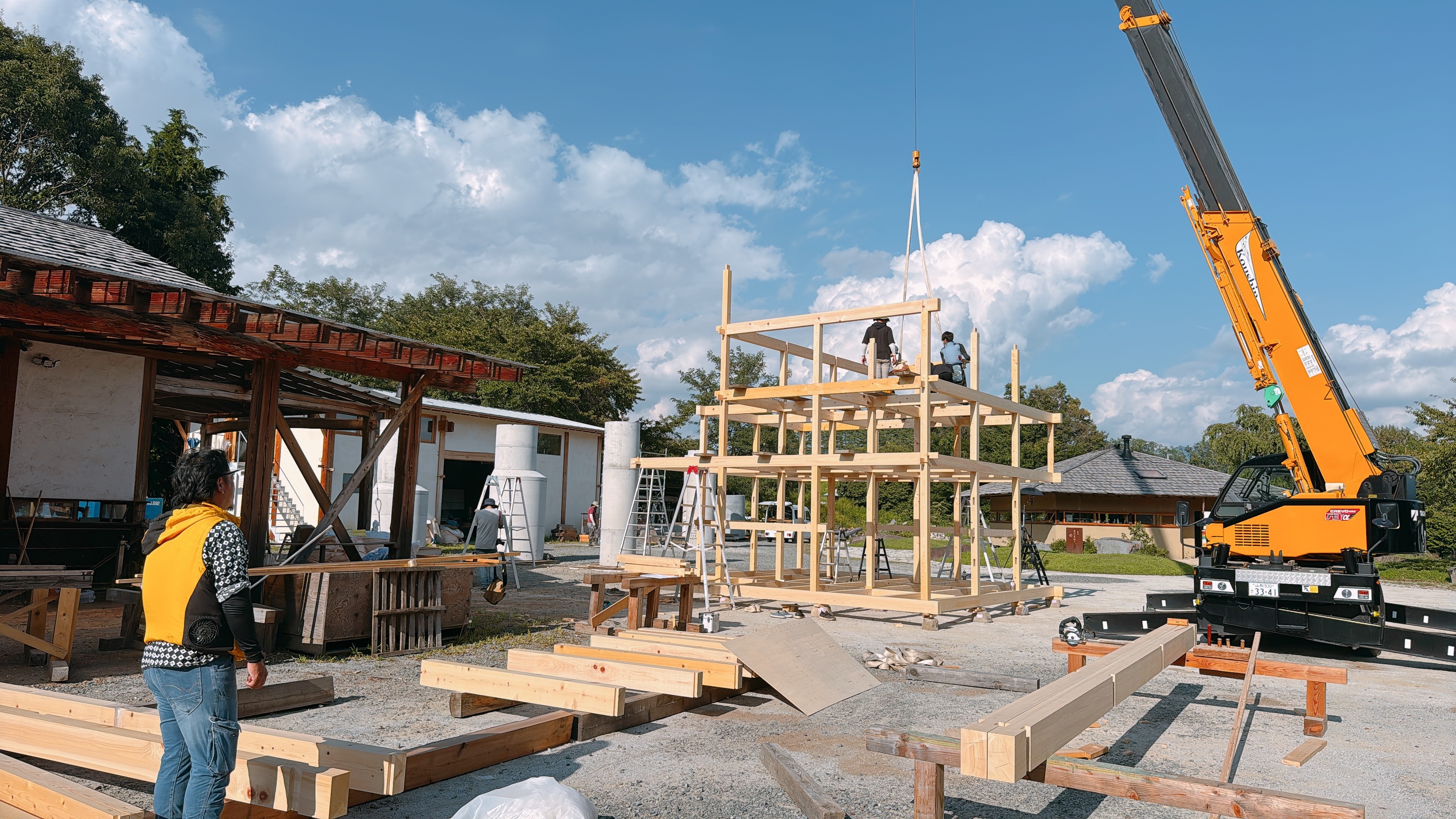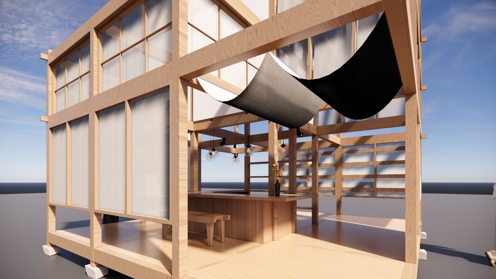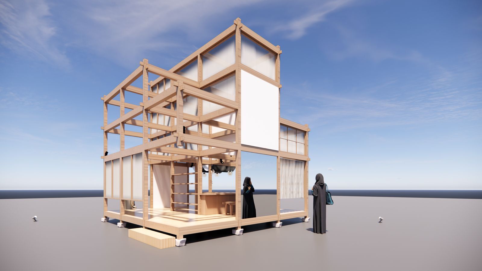 Built from a 5.6-meter cubic wooden framework, the structure was hand-crafted by SOBOKUYA's carpenters in Japan using traditional joinery techniques. After full-scale mock-up construction, it was shipped to Dubai and reassembled on-site by the same craftsmen -- embodying the precision, humility, and warmth of Japanese craftsmanship in an international setting.